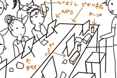 .でっかいテーブルに鏡が置かれていて、10人ぐらいいっぺんにスタイリング